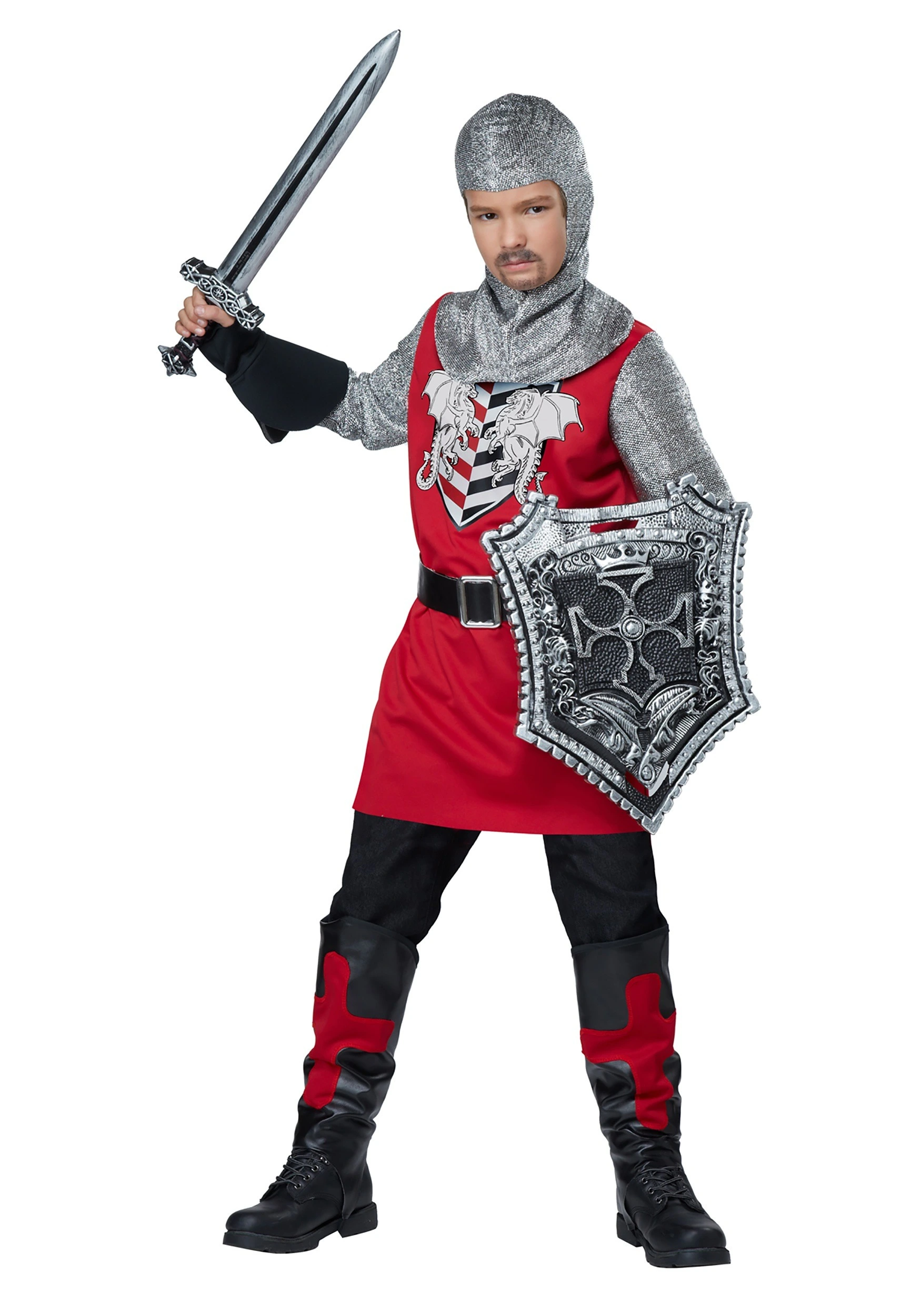 This costume is sure to have him feeling like a knight who can battle the evildoers in the realm, or at the very least, slay a dragon or two! A detailed ensemble look means that he’ll have the perfect style for riding his trusty steed at the jousting court, or the dashing style to strut up the dangerous mountain path to the dragon’s lair. There’s always the chance that dragon is in the mood to barbecue some knights though, so we always recommend he ride in the middle of the pack. Or, if he’s feeling especially confident, ride at the front, next to the king! Kings usually survive that stuff, right? Well, time is a wasting! Duty calls! Don that armor and ride into battle, knight!