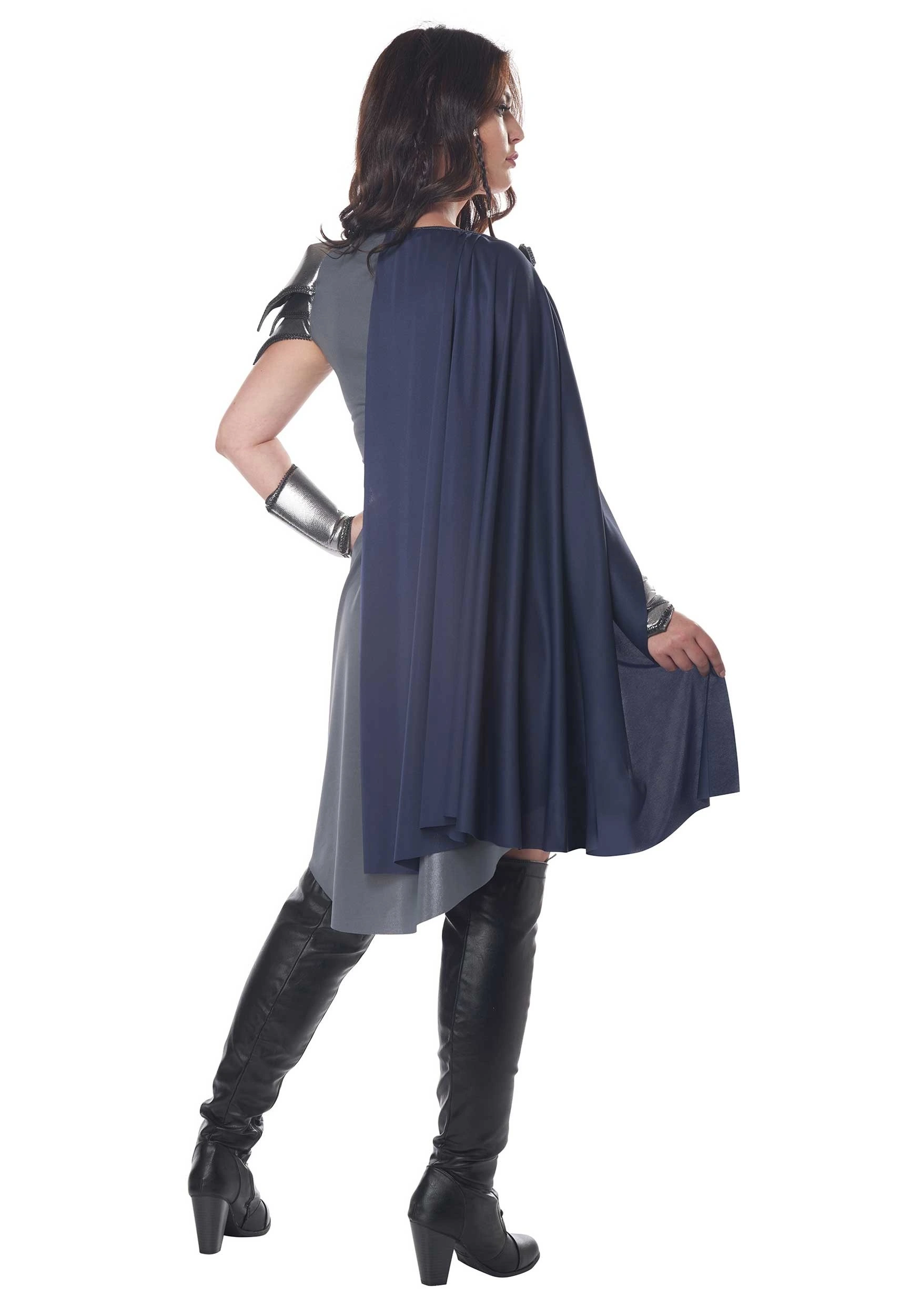 This costume is both tough and chic with a sleek dress that has faux leather accents to make you look ready for a fight. Gray fabric is layered over a soft chainmail texture base. A dramatic cape falls off one shoulder to make each of your entrances a showstopper. The look is polished off with a metallic helmet headpiece, silver gauntlets, and a faux leather belt to make sure you’re battle-ready. Â