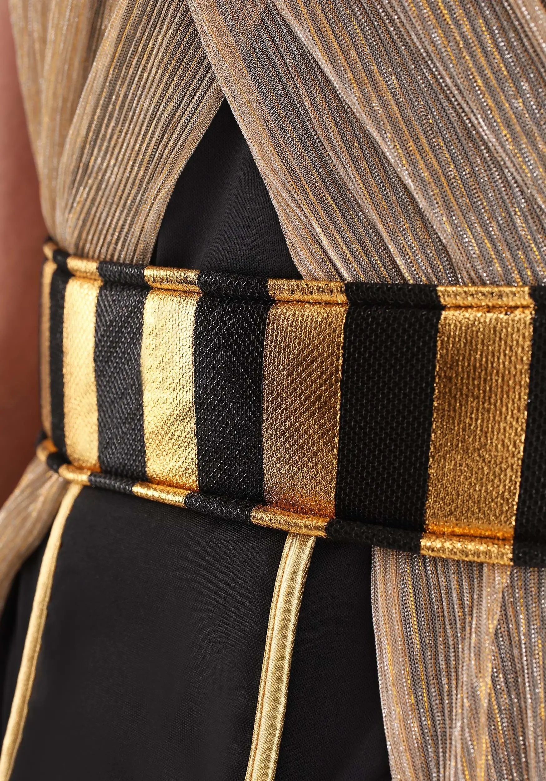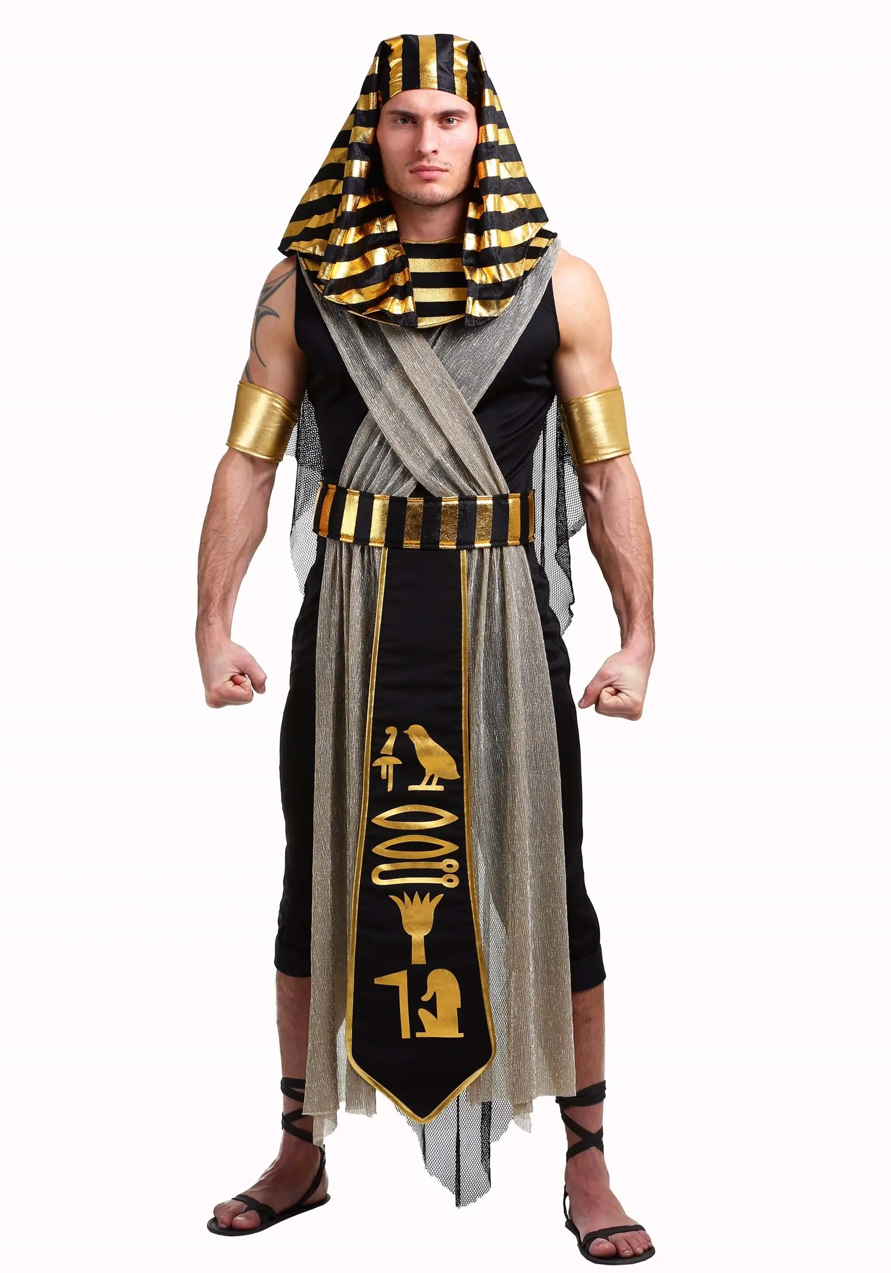 Our costume designers pulled out all the stops on this high quality outfit! This men’s Egyptian style costume brings you the look of an ancient king, complete with a black bodysuit, belt and wrap. The pieces have shimmering gold accents to give you a regal look that will make any subject feel your awesome might. The belt even has golden hieroglyphics on it for added effect. Of course, no pharaoh costume would be complete without some great accessories, so this one comes with a cape, some gold armbands and a luxurious headpiece that looks like something that King Tut would wear. What else could a king ask for (except complete and total subservience from his servants)?