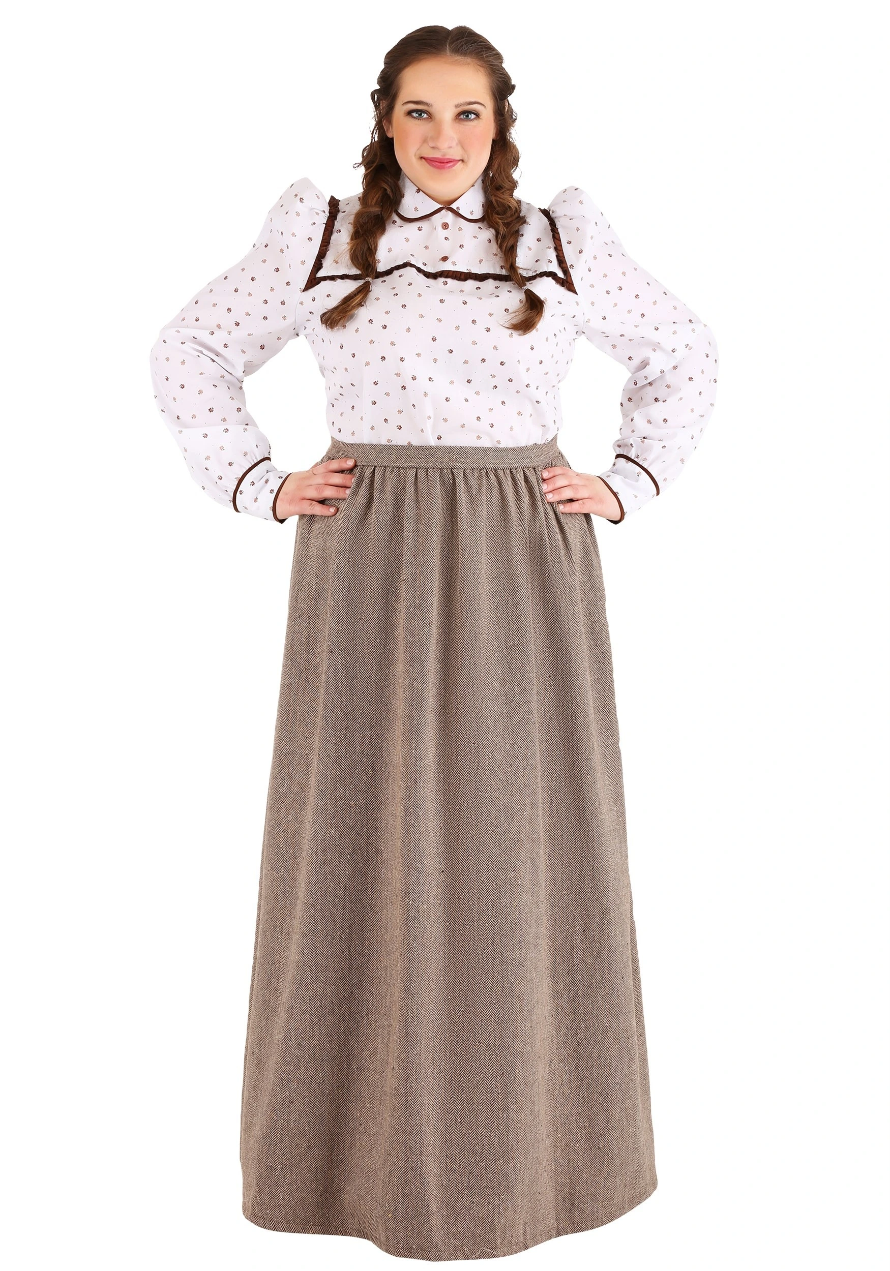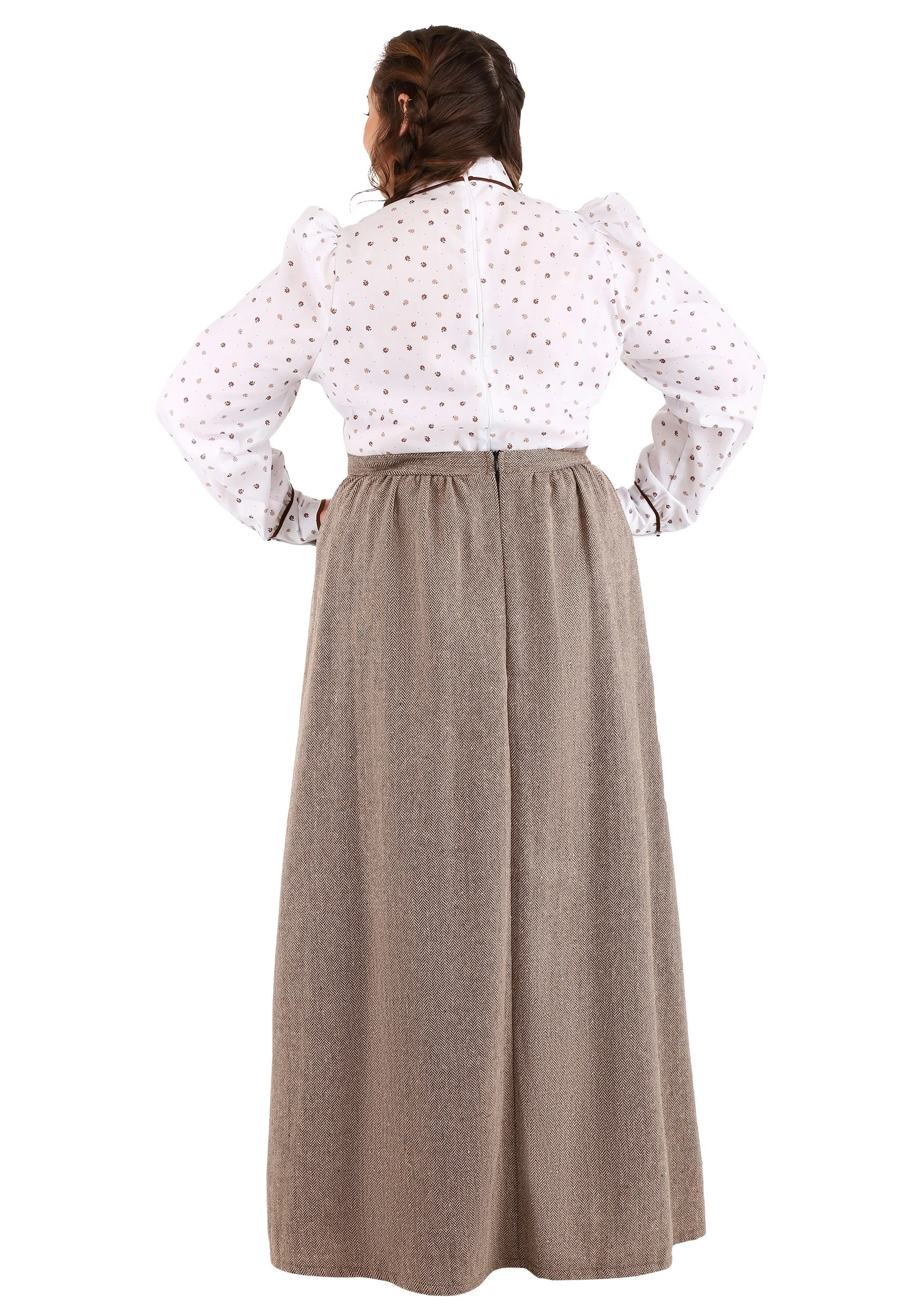 Prepare for your very own pioneer adventure with this Women’s Plus Size Westward Pioneer Costume. The exclusive costume is 100 percent polyester, which we admit wasn’t invented until about 100 years after the Oregon Trail period, but it still looks authentic, and honestly, it’s a lot more comfortable. The long-sleeved shirt features a collar, buttons down the front and trim along the front and sleeve cuffs, as well as a zipper on the back for easy wear. The floor-length brown skirt also has a zipper in the back for the same reason.