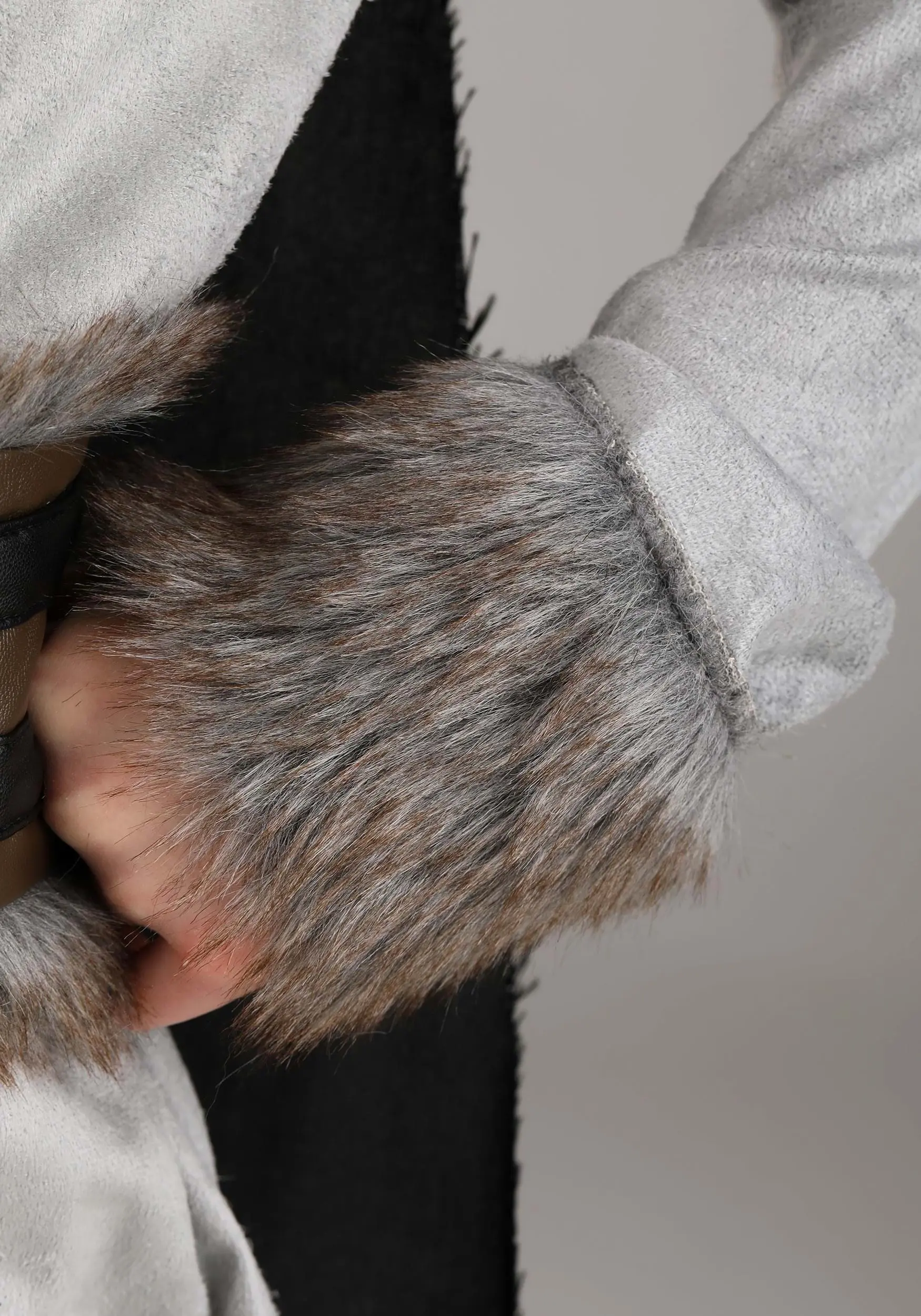 No other Viking tribe will dare oppose you while you’re wearing this exclusive Premium Viking Costume for Girls! The pullover gray faux suede tunic has green trim and gray faux fur edging, as well as a faux fur and faux leather belt that loops around your middle. The short hooded cape can be attached to the tunic. The matching jersey pants have a comfy elastic waistband and look great tucked into the faux leather boot covers with their faux fur trim and lace-up details.